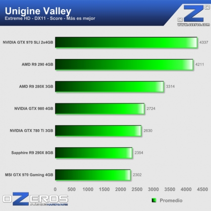 Unigine también tiene su propia batería de benchmarks que hacen sufrir a cualquier tarjeta gráfica. Con ellos, nuestras GTX 970’s realmente se lucen al obtener un aumento del 80% en el fantástico Unigine Heaven, y otro 88% en el impresionante paisaje de Unigine Valley.