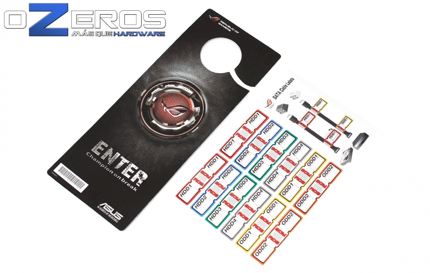 Un detalles que solemos ver en estas ultimas generaciones de productos ROG es el hangdoor el cual en este caso posee el logo Republic Of Gamers y la leyenda “ENTER Champion on break”. Además incluye un set de etiquetas para marcar los cables de conexión y así mantener un mejor orden a la hora del armado.