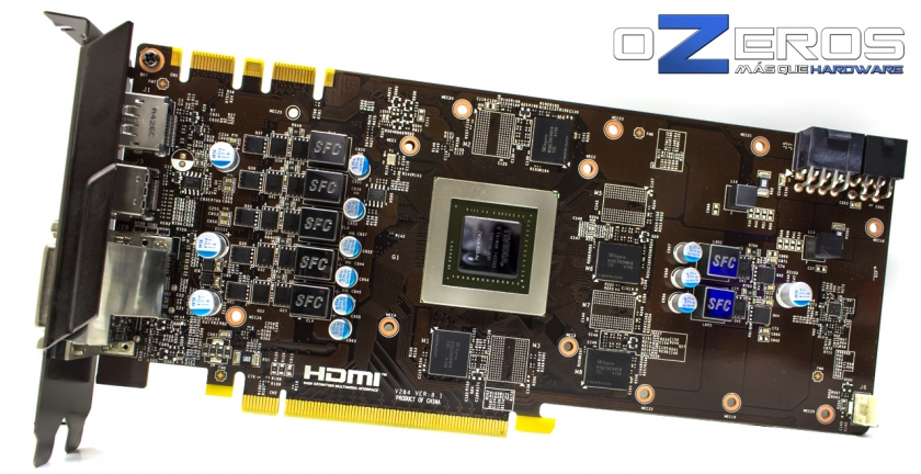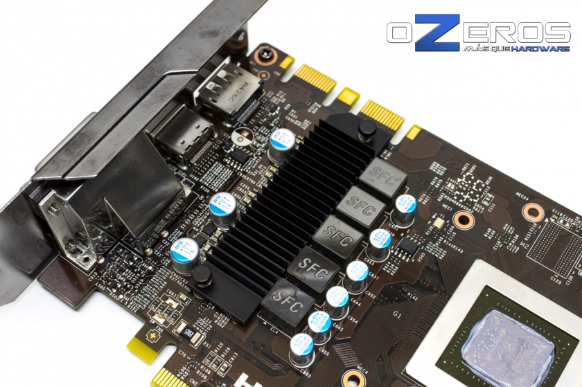 Bajo el disipador nos encontramos con cinco mosfets Nikos PK616BA y seis mosfets Nikos PK632BA encargados de entregar energía constante y estable al GPU. Y en la parte superior se ubican los conectores SLI para poder conectar hasta tres GTX 760 en simultaneo.