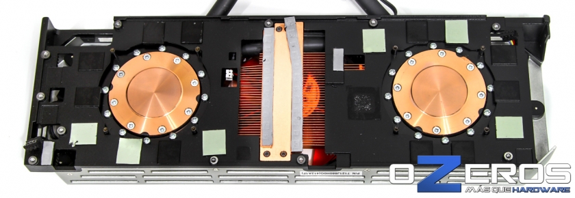 Como pueden ver desde este ángulo, el diseño del bloque intermedio está basado en pequeños canales para guiar desde adentro hacia afuera el calor que reparte el ventilador central. El interior está hecho en cobre y se encarga del VRM, el exterior es de aluminio anodizado y se encarga de tareas menores, como el minúsculo calor que generan las memorias vRAM.