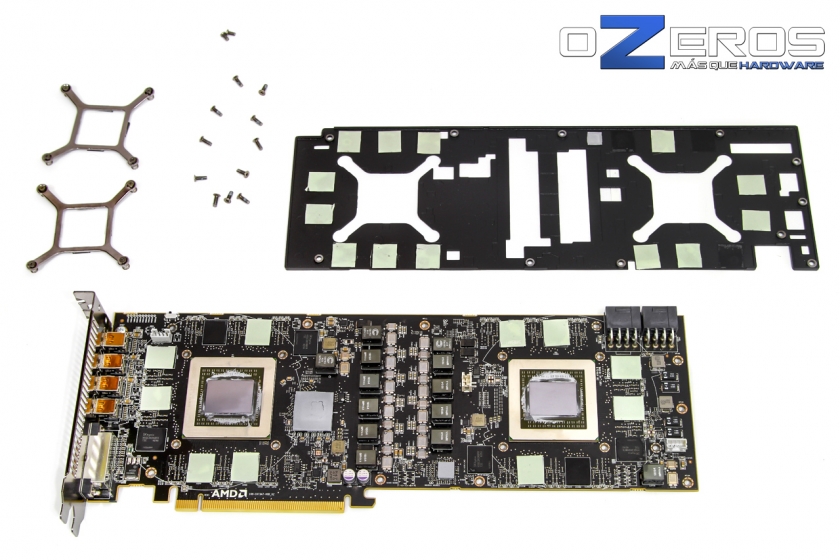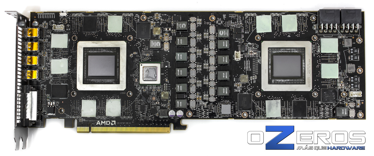 Justo a la derecha del primer GPU, a la izquierda, se puede apreciar una delicada almohadilla térmica que preferimos no mover en pro de su integridad. Bajo ella es posible encontrar el puente PCI-Express PEX8747 de 48 lanes, la versión más avanzada del fabricante PLX y que se encarga de unir los dos procesadores gráficos mediante CrossfireX al resto del sistema.