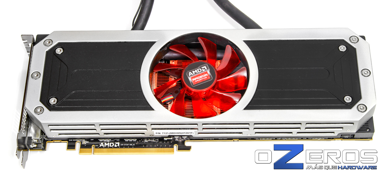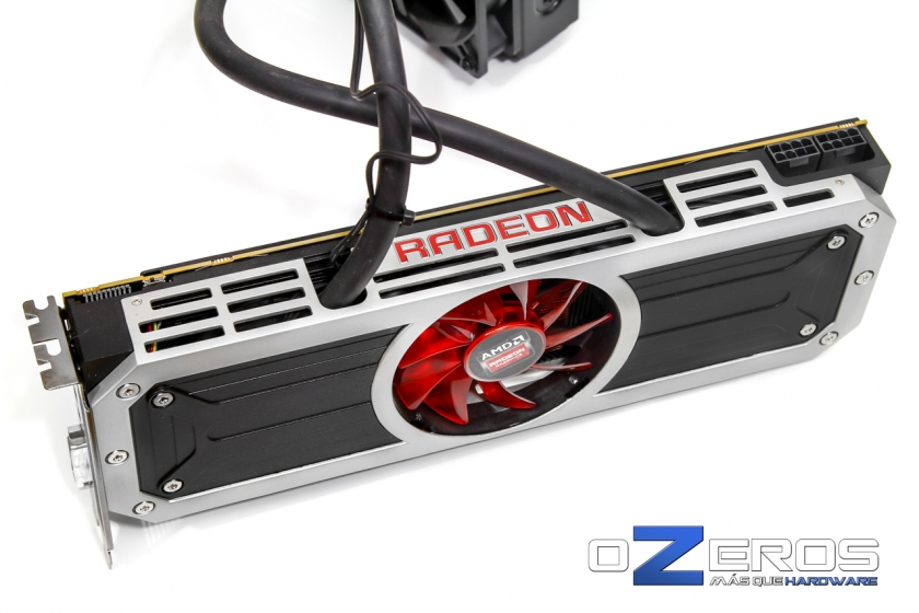 Por el costado, desde la cara visible hacia el lateral del gabinete, el logo Radeon se ilumina por reflexión desde el ventilador central con LEDs rojos. Lo más notable en todo caso, son las dos mangueras que van hacia el radiador exterior de la R9 295X2.
