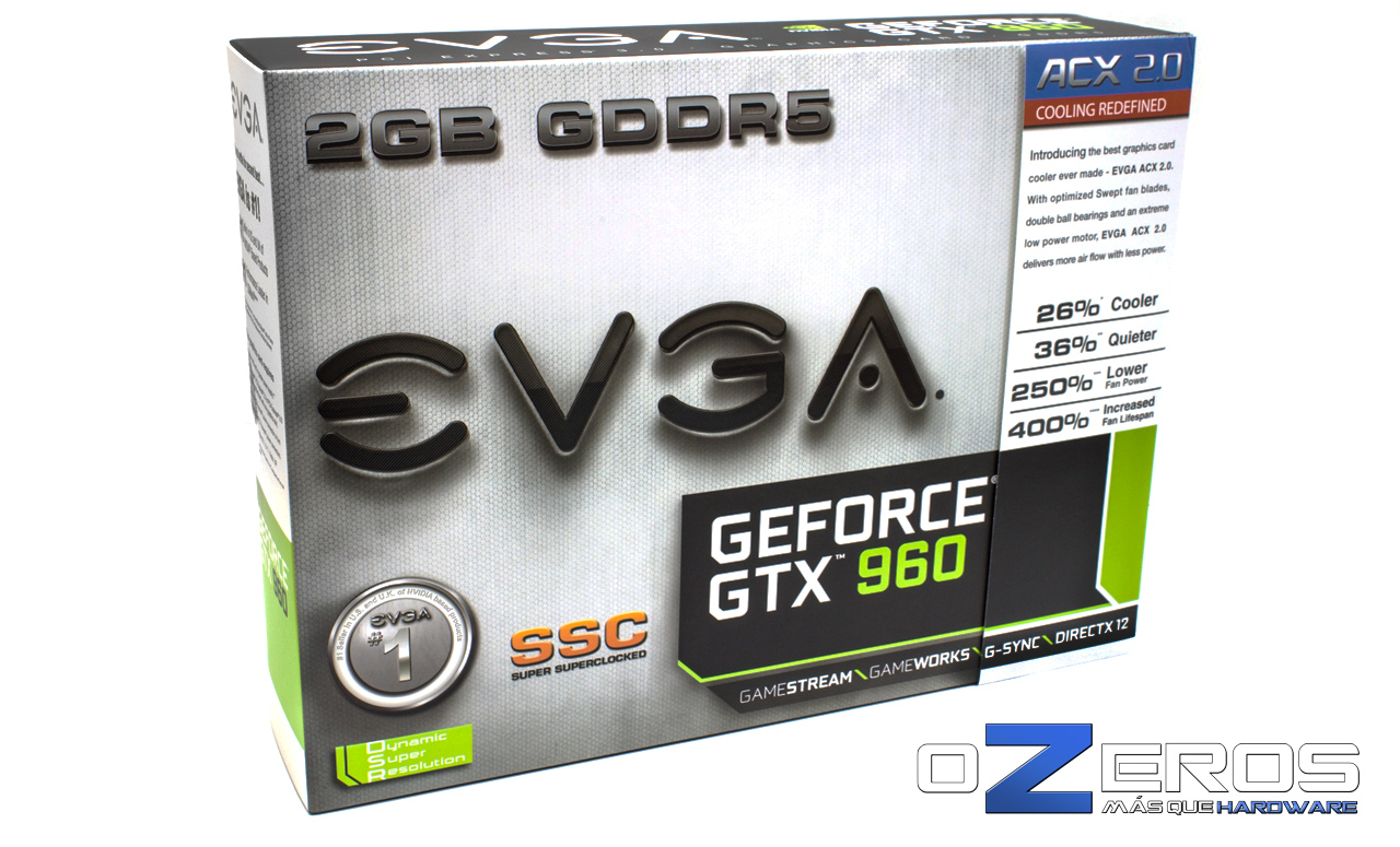 La EVGA GeForce GTX 960 Super SuperClocked ACX 2.0+ llega justo al segmento gamer popular. Con un precio de $209.99USD la EVGA GeForce GTX 960 SSC ACX 2.0+ no es algo que se pueda pasar por alto sin antes darle una mirada. El nuevo sistema de refrigeración ACX 2.0+ llega a desmitificar y olvidarnos de las polémicas y problemas pasados, aumentando el nivel de disipación de calor en un 6%. Cada uno de ventiladores poseen dos rodamientos de bola para prolongar su vida útil y entregar un mejor flujo de aire consumiendo menos energía. Además, la EVGA GeForce GTX 960 SSC ACX 2.0+ posee Quick Switch Dual BIOS, permitiendo al usuario seleccionar en la tarjeta el modo 0dB y el modo de bajas RPM sin tener que ajustar nada más. Tambien posee con diseño de energía de 6+2 fases el cual necesita ser alimentado con un conector de energía de 8 pins. El cerebro de EVGA GeForce GTX 960 SSC ACX 2.0+ es el nuevo GPU de NVIDIA GM 206 Maxwell, configurado de fábrica a una frecuencia de 1279 MHz con 1342 MHz de frecuencia boost y 7010MHz para los 2GB de memoria GDDR5, convirtiéndola en la GTX 960 mas overclockeada de fabrica que hemos revisado hasta el momento.