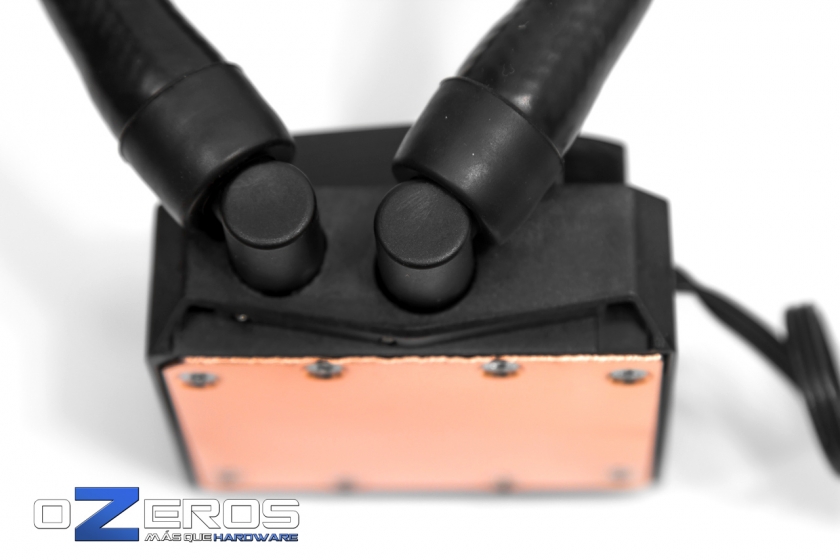 Cerrando lo que es el bloque-bomba del Corsair H100i podemos ver que las salidas o codos que compone el sistema tienen cierto nivel de rotación a pesar de ser en extremo firmes para girar. Recomendamos hacerlo con mucho cuidado.