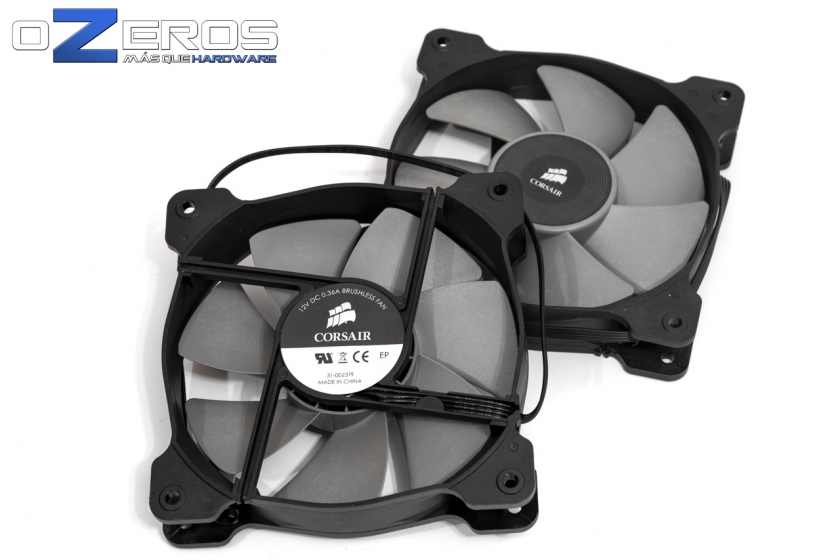 Dos ventiladores PWM vienen incluidos y corresponden al modelo SP120L, ambos en color negro-gris. Según Corsair, estos ventiladores cuentan con un diseño personalizado para mejorar la presión estática y entregar una mayor relación entre rendimiento/ruido. Su flujo de aire máximo se encuentra en los 77 CFM a un nivel sonoro de 37,68 dBA, mientras la presión estática para cada ventilador es de 4 mm/H2O.