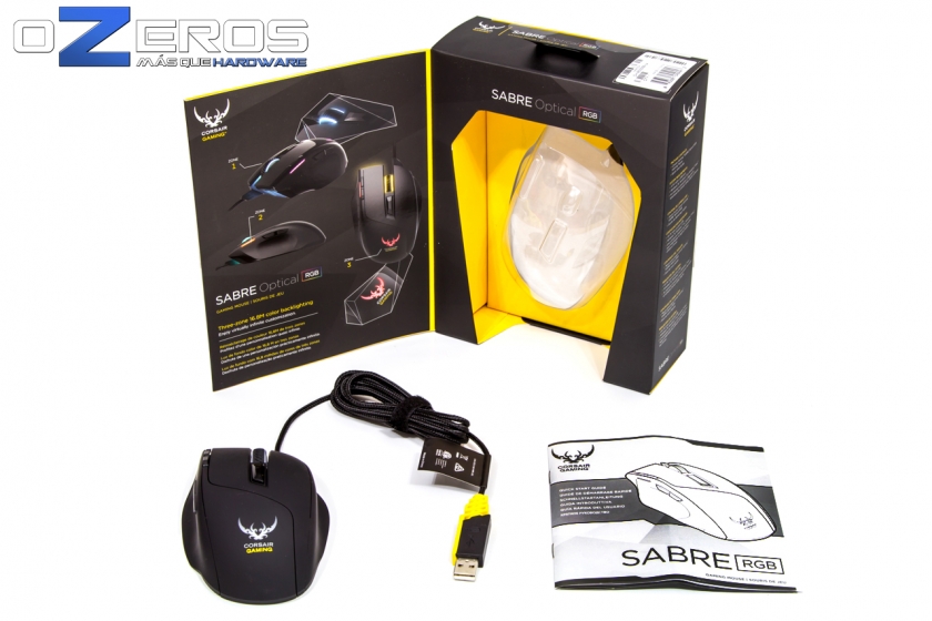 En una combinación de colores similar para toda la familia Corsair Gaming, negro y amarillo, el Sabre Optical RGB viene debidamente empacado y con todas sus características en el exterior, las mismas que ya llevamos comentando desde el comienzo.