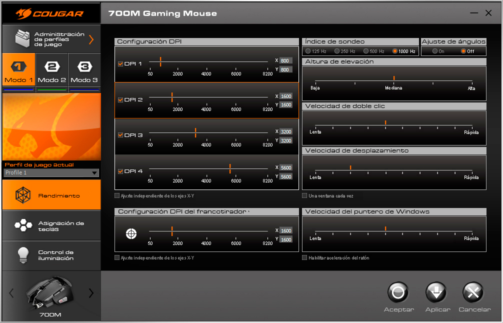 En el caso del Mouse Cougar 700M vemos que es muy similar, primero tenemos la pestaña de rendimiento donde podemos regular los DPI para cada modo, los DPI del botón “Franco Tirador”, velocidad de respuesta, doble click, desplazamiento y la velocidad del puntero.