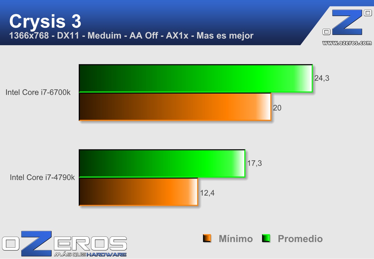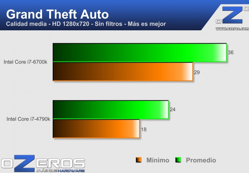 Pasamos a ver el rendimiento del procesador gráfico integrado del Core i7-6700k. El 100% de las veces estas pruebas hacen uso de motores de juegos comerciales, y en algunos de estos casos, estas pruebas son con tintes variables, ya que a pesar de que los caminos están pre-definidos, los movimientos, acciones y reacciones del resto son completamente distintas de una u otra corrida.Todas y cada una de las pruebas fueron ejecutadas un mínimo de 3 veces para evitar corridas falsas,lucky runsy reducir el factor de error al mínimo. Por otro lado, todas fueron probadas a una resolución HD (1280 x 720 o 1366×768) además de sus opciones gráficas en medio. Los detalles de filtrado y calidad de imagen se indican en cada imagen.