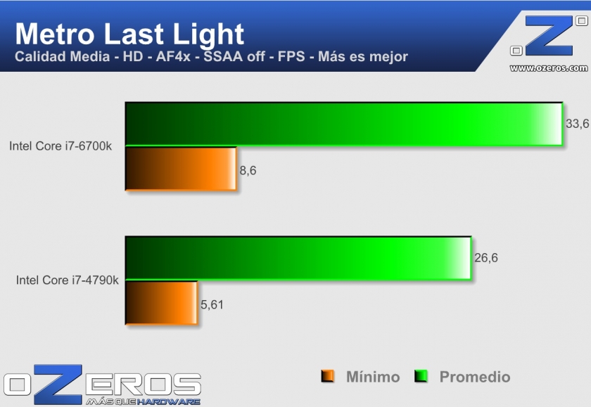 La misma tendencia vista en las pruebas sintéticas se repite en escenarios reales, el rendimiento del 6700k es prácticamente el mismo del 4790k.
