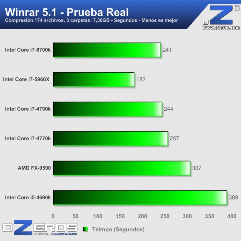 La compresión de datos es una tarea muy común y que realizamos a diario. Aquí realizaremos la compresión de 3 carpeta que contienen 174 archivos y suman un total de 7,36 GB, esto nos dará una buena referencia acerca de la capacidad de compresión que posee el Intel Core i7 6700k.