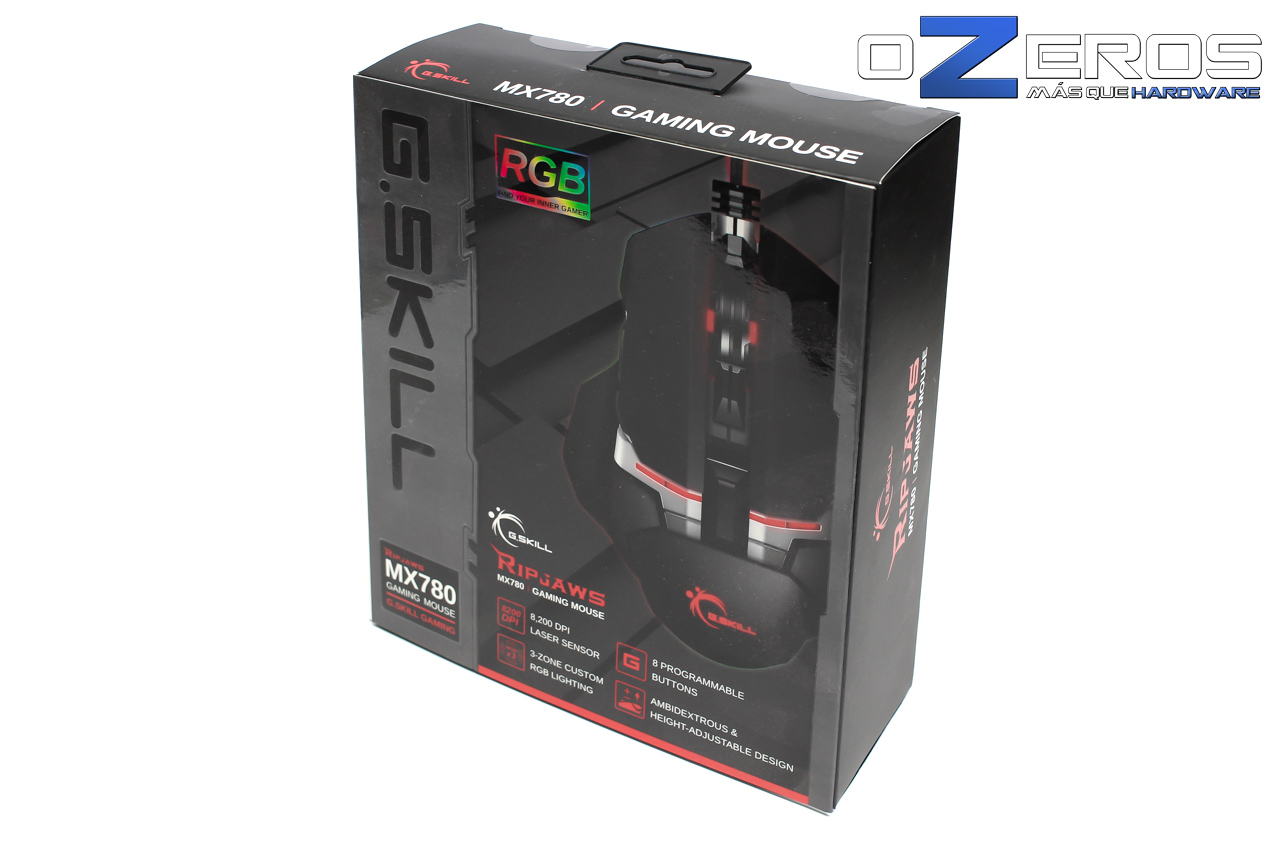 Vemos un empaque bastante sólido, que en su frente nos muestra el mouse desde una vista superior, se destaca el nombre “Ripjaws MX 780” además de sus principales características, en la parte posterior apreciamos una vista diagonal del mouse, junto a el una lista de propiedades y características, el empaque cuenta con una cubierta abatible que al abrirla nos muestro el MX780 junto a sus accesorios, al abrir la caja nos encontramos con un segundo empaque, esta vez de plástico que protege y mantiene todo en su lugar.