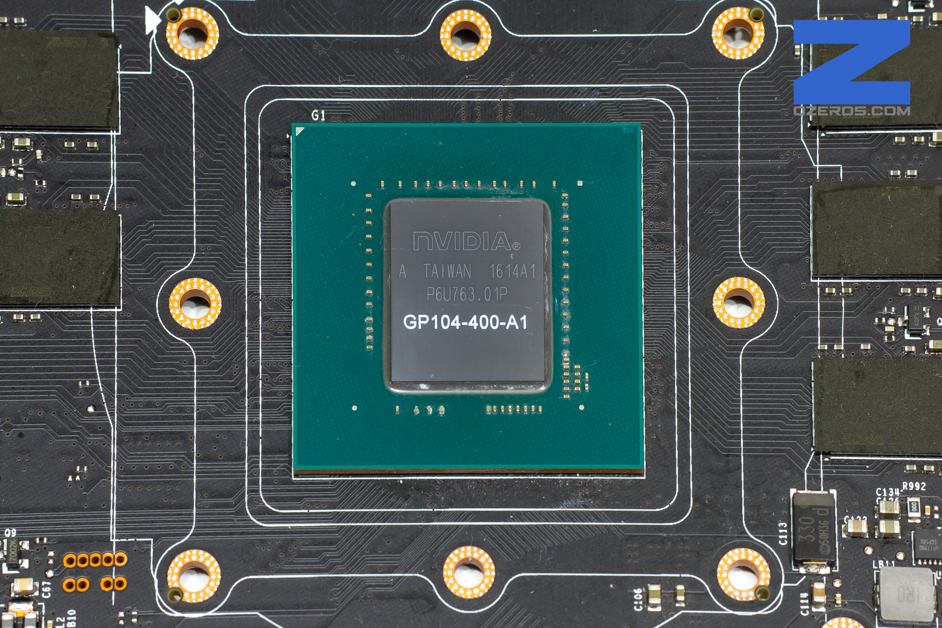 Luego de remover bastantes tornillos tenemos completamente desnuda nuestra GTX 1080, inmediatamente nos vamos al GPU, podemos conocer al fin en gloria y majestad al GP104, primer procesador gráfico basado en la nueva arquitectura Pascal. Encontramos un PCB bastante limpio y ordenado, y un sistema eléctrico renovado con respecto a las generaciones anteriores, pasando de un sistema de 4 fases de poder a un sistema de 5 fases dualFET, se añadió capacitancia extra al sistema de filtrado y se utiliza un PCB de baja impedancia, con estos cambios fue posible aumentar la eficiencia de energía en alrededor de un 6%, aumentado con esto la capacidad de Overclock respecto a las series 980. En la esquina superior vemos el solitario conector de 8 pines el cual es capaz de entregarnos hasta 150W, esto sumado a los 75W del puerto PCI-express nos da como resultado 225W de consumo teórico para la GTX 1080. Llegamos a los chips de memorias GDDR5x fabricados por Micron, en total son 8, totalizando 8GB de memoria de video. Finalmente llegamos al sistema de refrigeración, diseñado para mantener un desempeño consistente incluso en los ambientes más difíciles, incluyendo configuraciones multi-GPU y gabinetes de tamaño reducido. Construida alrededor de un ventilador radial con una avanzada refrigeración de cámara de vapor, la GTX 1080 Founders Edition mueve todo el aire caliente fuera del gabinete. En las imágenes finales podemos ver los pads térmicos para memorias y fases y los conectores para el ventilador y para el led lateral en el chasis de refrigeración.