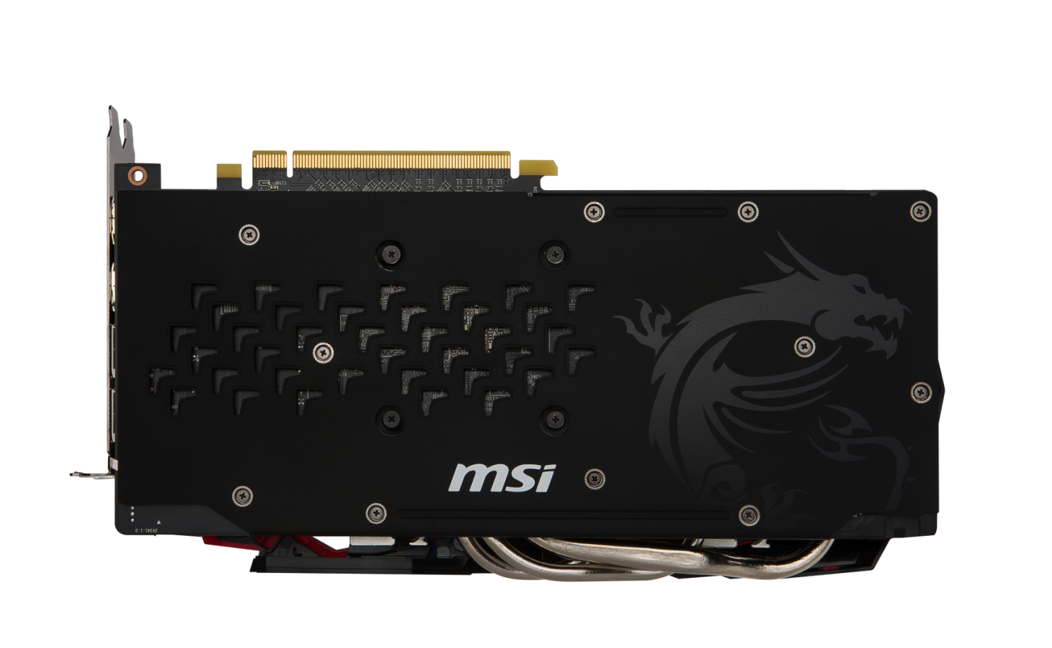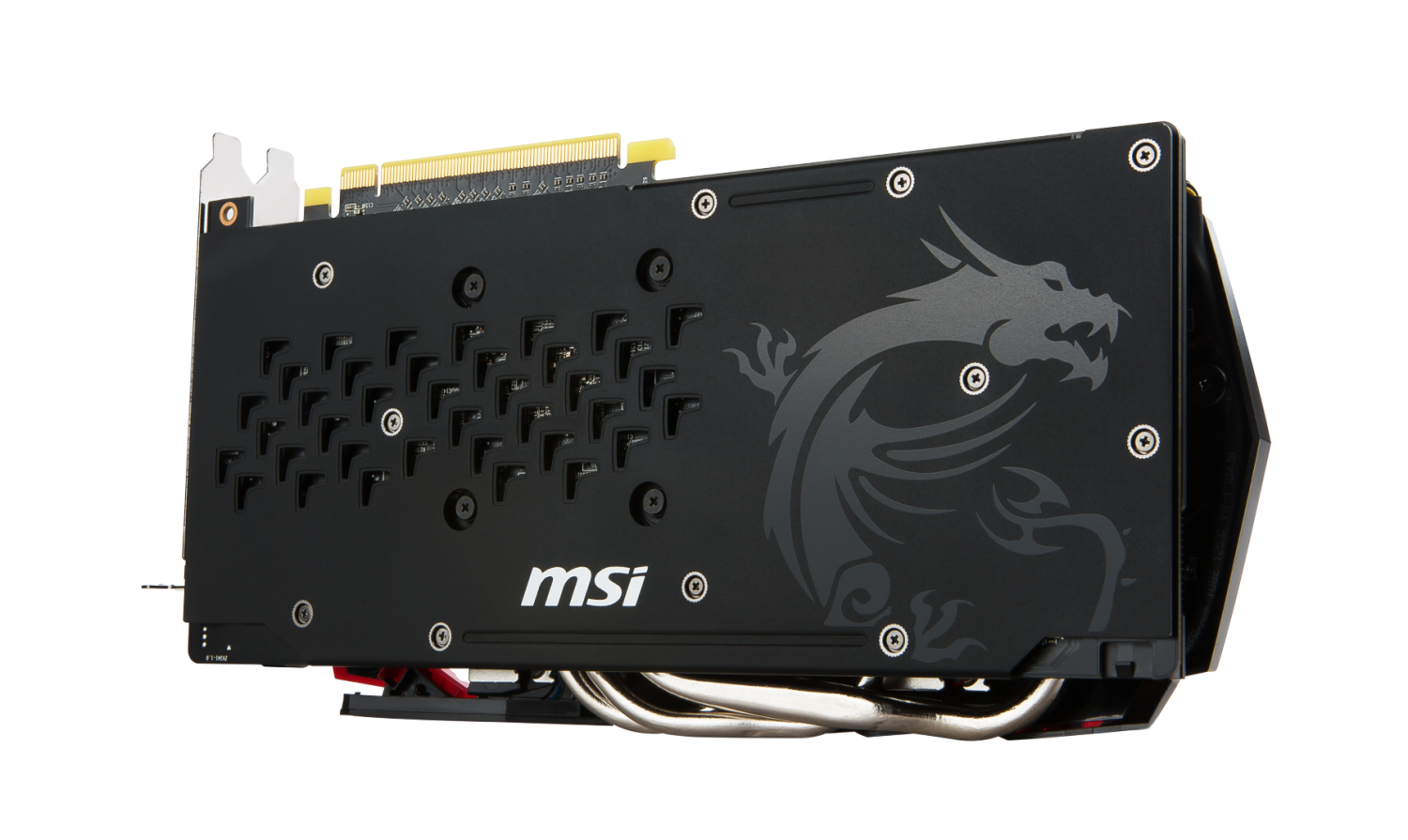 Comenzamos con su diseño ya que los cuatro modelos muestran el disipador negro y rojo con un diseño bastante agresivo. En el lado de la tarjeta hay un logo de MSI personalizable al ser iluminado por luces RGB y que puede ser ajustado con el software MSI Gaming. En la parte trasera tenemos un back plate completo para las tarjetas Gaming X y por el lado de la refrigeración tenemos dos ventiladores frente al disipador que posee tres heat pipes de 8mm. Estas heat pipes están aplanadas al llegar a la base de cobre niquelado para tener un mejor contacto con el núcleo del GPU y así aumentar la transferencia de calor. Este disipador está algo “recortado” de acuerdo a otras versiones utilizadas en tarjetas de mas alto nivel, pero debería ser suficiente para mantener las temperaturas de esta serie bajo control.