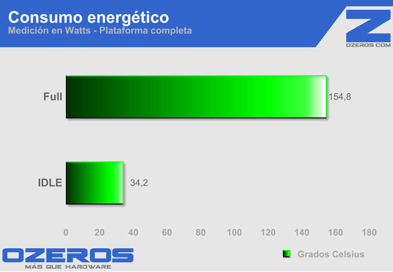 Para calcular el consumo del equipo utilizamos el método del amperímetro y el multitester; El primero de ellos va midiendo una de las fases en el cable de salida hacia la línea energética de nuestro hogar, el segundo mide directamente la tensión en nuestro hogar. Multiplicando ambos factores obtendremos el consumo del equipo, expresado en Watts. Teniendo esto claro, usaremos dos estados de nuestro equipo para determinar los valores: En un principio, dejaremos el equipo en reposo durante 15 minutos para luego tomar cuenta de los valores entregados por las herramientas. Luego de eso, llevaremos cuenta del consumo en todos los benchmarks que utilizamos, para quedarnos con el registro más alto de ellos.