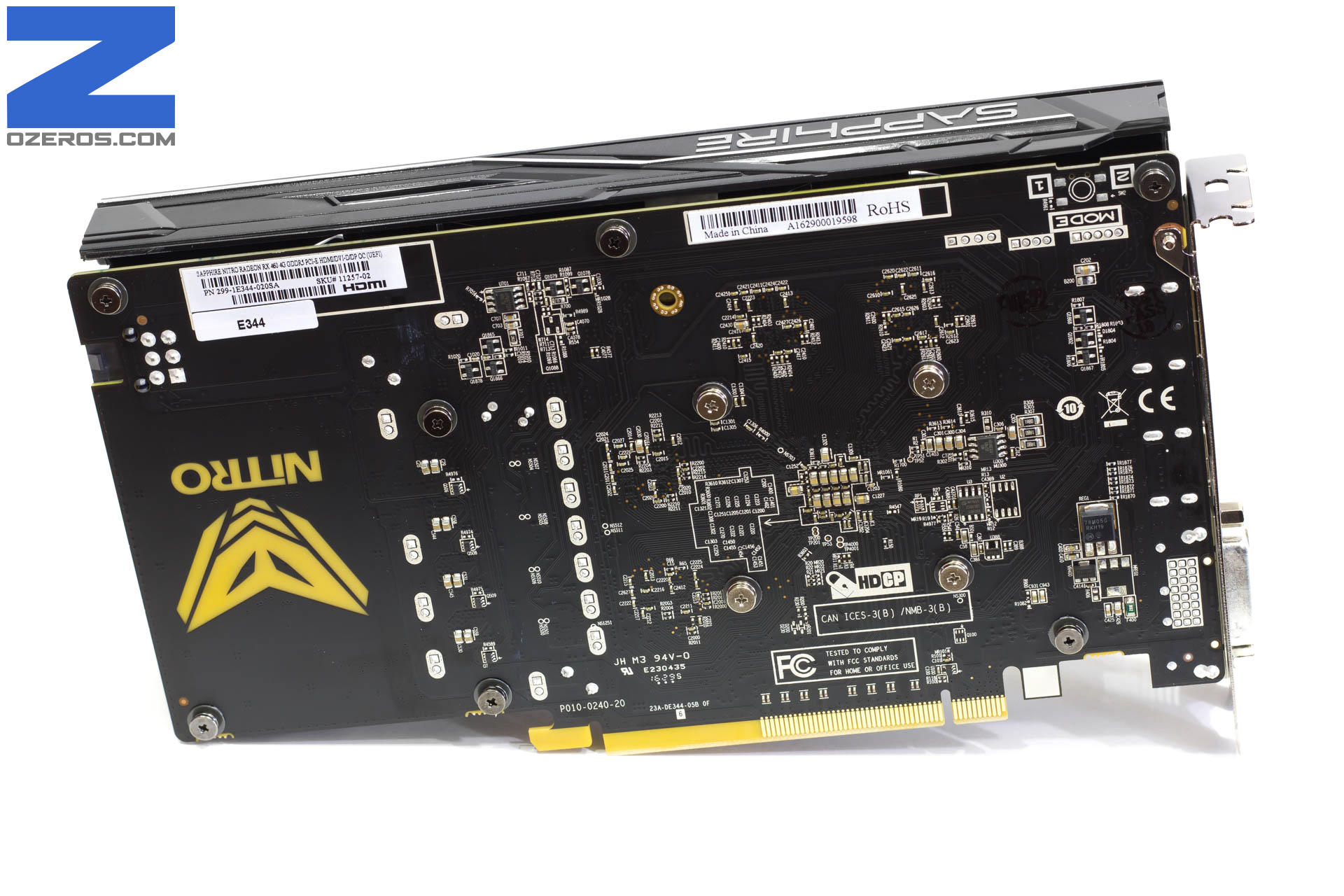Al dar una primera mirada a la Sapphire Radeon RX460 Nitro, vemos una estética similar al de sus hermanas mayores, vemos que Sapphire no se hace problemas y utiliza el mismo diseño para toda su línea de tarjetas gráficas, vemos que cuenta con dos ventiladores y es un poco más corta que las RX480 y 470. En su parte posterior apreciamos un llamativo logo de color amarillo, el cual cuenta con retroiluminación led. Vemos el logo de Sapphire en el costado lateral de la tarjeta y el logo “Nitro” en los ventiladores. Su puerto PCI-express es de 8x, y esto no es un recorte por software, ya que podemos apreciar que solo hay circuito hasta la mitad del puerto PCI-express. Para la alimentación contamos con un conector de 6 pines, capaz de entregarnos hasta 75W, llegando a un consumo total teórico de 150W (75w puerto pci-express + 75W conector de 6 pines). Para las salidas de video encontramos un DVI, un DisplayPort y un HDMI.