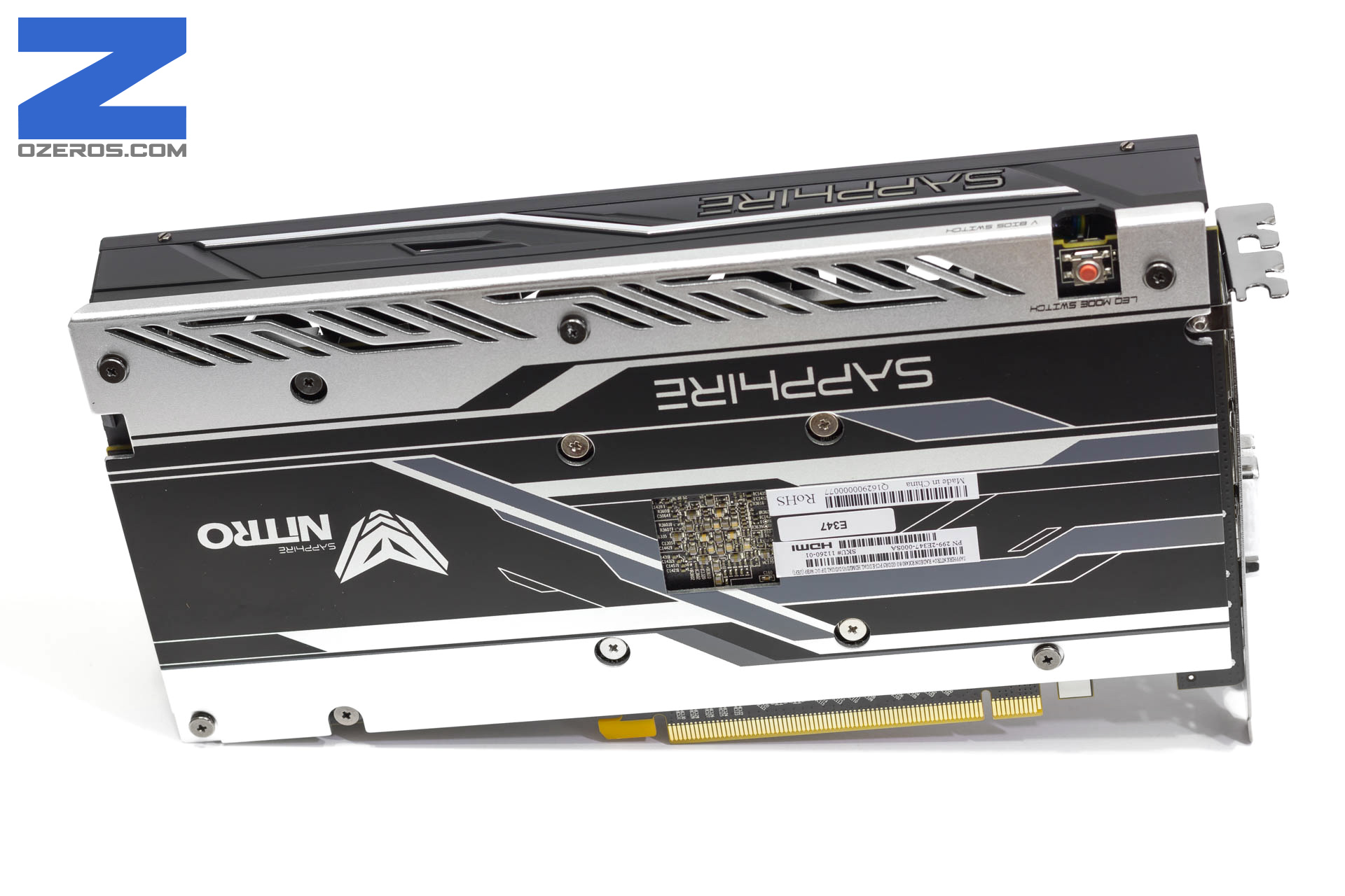 Al dar una primera mirada a la Sapphire Radeon RX 480 vemos un diseño completamente fuera de lo referencial, dejando de lado el ventilador tipo blower e incorporando un sistema de dos ventiladores. Al voltear la tarjeta vemos el backplate, el cual tiene detalles en colores negro y plateado, incorporando las leyendas “Sapphire” y “Nitro”, en la parte superior encontramos un switch para cambiar entre ambas BIOS y un boton con el que podemos cambiar el color de la ilumación del logo Sapphire que esta en el costado, esta iluminación es RGB. Encontramos el solitario conector de energía, el cual es de 8 pines, el cual nos entrega 150W, sumados a los 75W del puerto PCI-express nos dan 225W de consumo teórico, muy por encima del TDP (o consumo) de la tarjeta. Y finalmente en las salidas de video contamos con un puerto HDMI. un DVI y 3 DisplayPort.