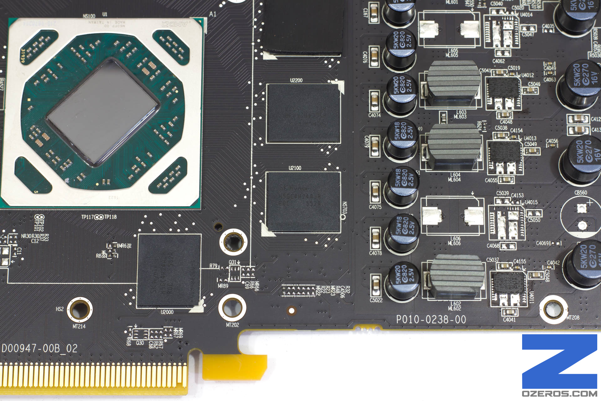 Al remover el sistema de refrigeración vemos que podemos separar el frontis plástico del disipador, esto facilita bastante la tarea de realizar mantenciones a nuestra tarjeta gráfica. Vemos tomas frontales y traseras del backplate, para luego pasar a una vista detallada del disipador, donde encontramos 3 heatpipes acompañados de un ejercito de aletas de aluminio. Al remover el disipador vemos que su PCB tiene una forma algo extraña en el extremo superior, no es completamente recto. Su PCB está bastante poblado, encontramos el pequeño Polaris 10 en una orientación diagonal y con una cantidad prudente de pasta disipadora. Su sistema eléctrico cuenta con 5 (4+1) fases de poder acompañadas de bastantes capacitores de estado sólido, vemos los 8 chips de memorias que totalizan 4GB. Finalmente vemos primeros planos de los conectores para los ventiladores, iluminación y poder.