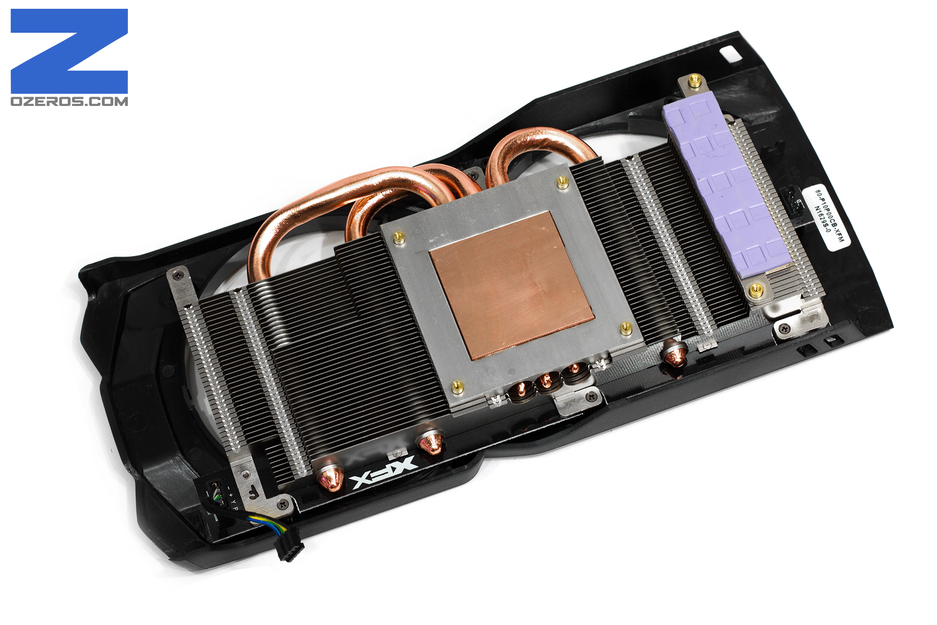 Al desmontar el sistema de refrigeración vemos que podemos sacar los ventiladores con gran facilidad, es solo presionar el seguro y ya podemos retirarlos, además carecen de cables, utilizan un sistema de contacto para energizarse, esto ayuda bastante al querer remover el polvo que se acumule entre las aletas de aluminio, además de conexión a la tarjeta gráfica es desmontable por ambos lados, aunque como no todo puede ser color de rosa debemos decir que nos parece impresentable la forma en que se aplicó la pasta disipadora al núcleo de XFX Radeon RX 470, esperemos que este sea un caso particular de la muestra que recibimos y no se dé en toda la serie. Finalmente vemos el disipador, el cual posee una gran base de cobre que tiene contacto directo con el núcleo y cuenta con 3 heatpipes de cobre que recorren las aletas de aluminio.