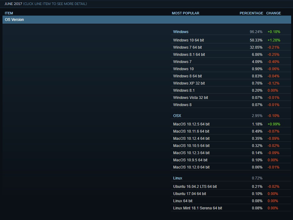 En el lado del software, el 80% de los gamers prefieren la plataforma creada por Microsoft, con más de un 50% perteneciente solo al último SO de la compañía, Windows 10 64-bit. OS-X se lleva un 2,95% de uso y Linux un 0,72%.