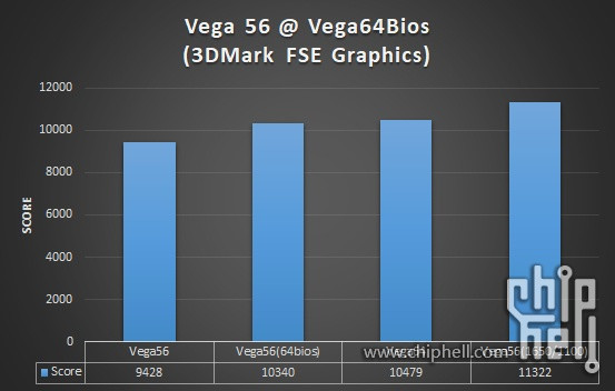Aun cuando no se desbloquearon los núcleos restantes que el GPU de la Vega 56 tiene bloqueados, el aumento de frecuencias en las memorias, de 800 MHz a 945 MHz, y en el núcleo, de 1471 MHz a 1545 MHz (boost), permitieron que la tarjeta Vega de menor gama alcanzara y quedara tan solo un 2% atrás de la RX Vega 64 en el benchmark 3DMark FireStrike.