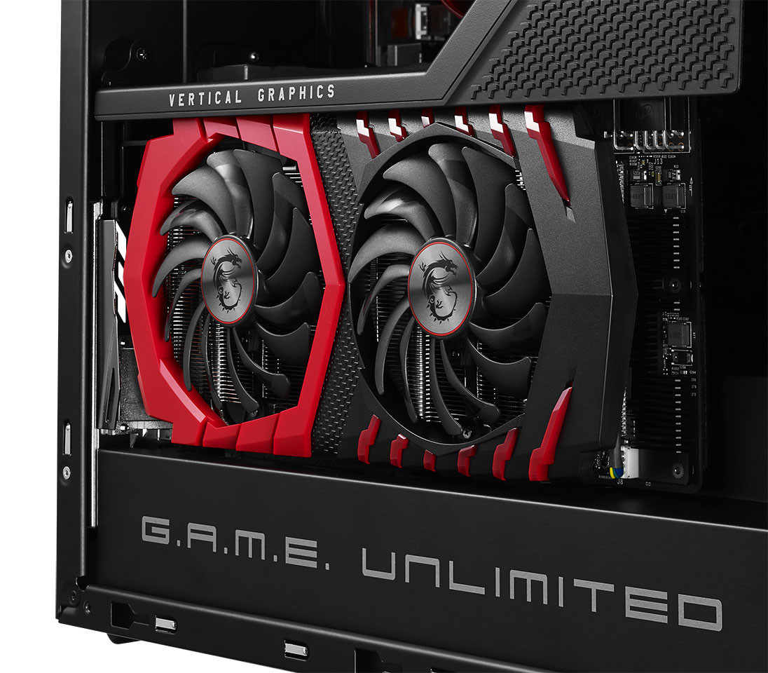Construido en torno a un gabinete diseñado especialmente por MSI, el nuevo Infinite A destaca por incorporar iluminación LED RGB controlable mediante la aplicación Mystic Light Sync, por un grueso panel de vidrio templado y por ubicar la tarjeta gráfica principal en un particular posición para mejorar el flujo de aire.