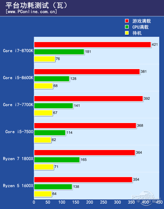 En el consumo, donde la barra roja corresponde al equipo bajo 100% de carga y gaming, la barra verde corresponde al equipo bajo 100% de carga y la barra amarilla corresponde al equipo en idle, vemos un ligero aumento. Las temperaturas, varían en más de 10 grados con respecto a los procesadores Kaby Lake.
