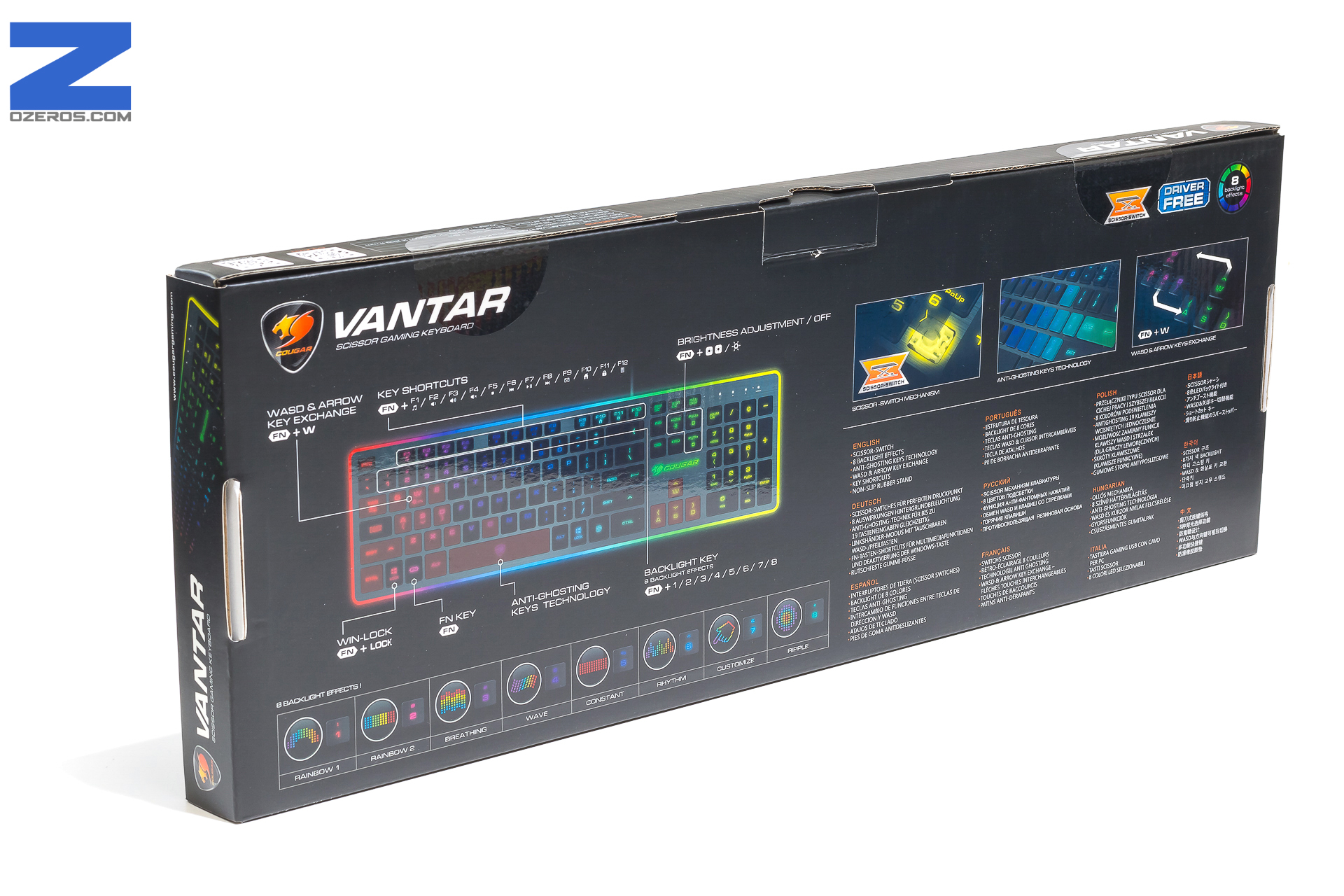 El Cougar Vantar es un teclado de membrana con interruptores de tijeras, con funciones multimedia y diferentes características que lo delatan como un producto enfocado al público gamer. Tiene un total de 8 efectos de iluminación, anti-ghosting en 19 teclas y dos niveles de altura.