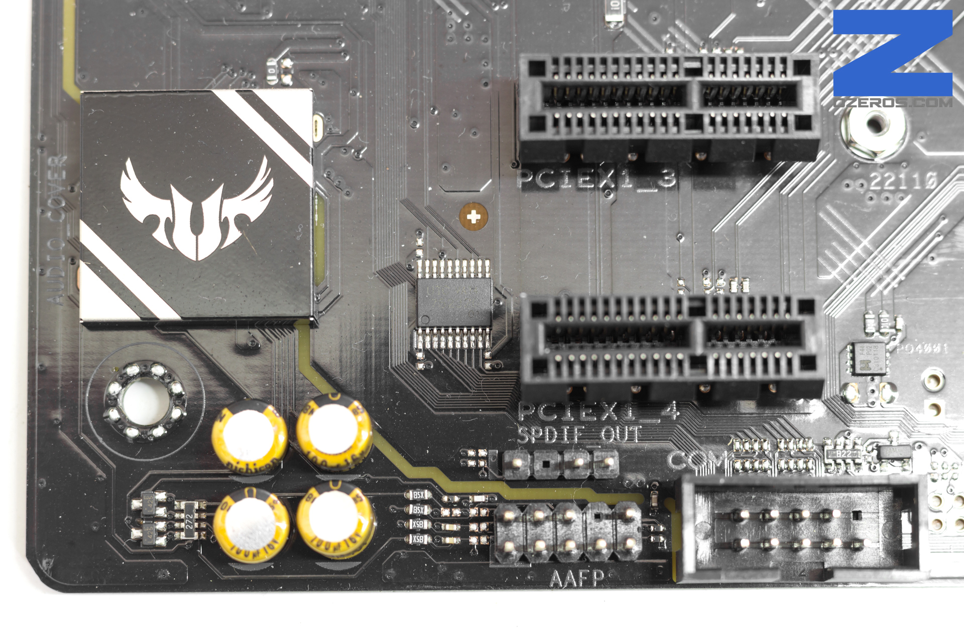 Seguido a esto pasamos a la etapa de sonido con un chip Realtek® ALC887 protegido con una carcasa metálica con el logo TUF. Un poco más arriba, cercano a la etapa de sonido, tenemos el chip Super I/O Nuvoton NCT5582D encargado del monitoreo de temperaturas y otros.