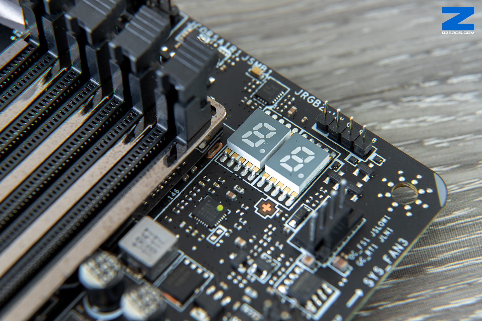 En la esquina derecha nos encontramos con cuatro zócalos para memoria RAM DDR4 reforzados con Steel Armor, para aumentar la durabilidad del puerto y dar mayor seguridad a la hora de ejercer presión al instalar un módulo de memoria. También vemos un práctico monitor LED para una rápida identificación de errores, un botón OC y botones para reiniciar y encender/apagar la plataforma.