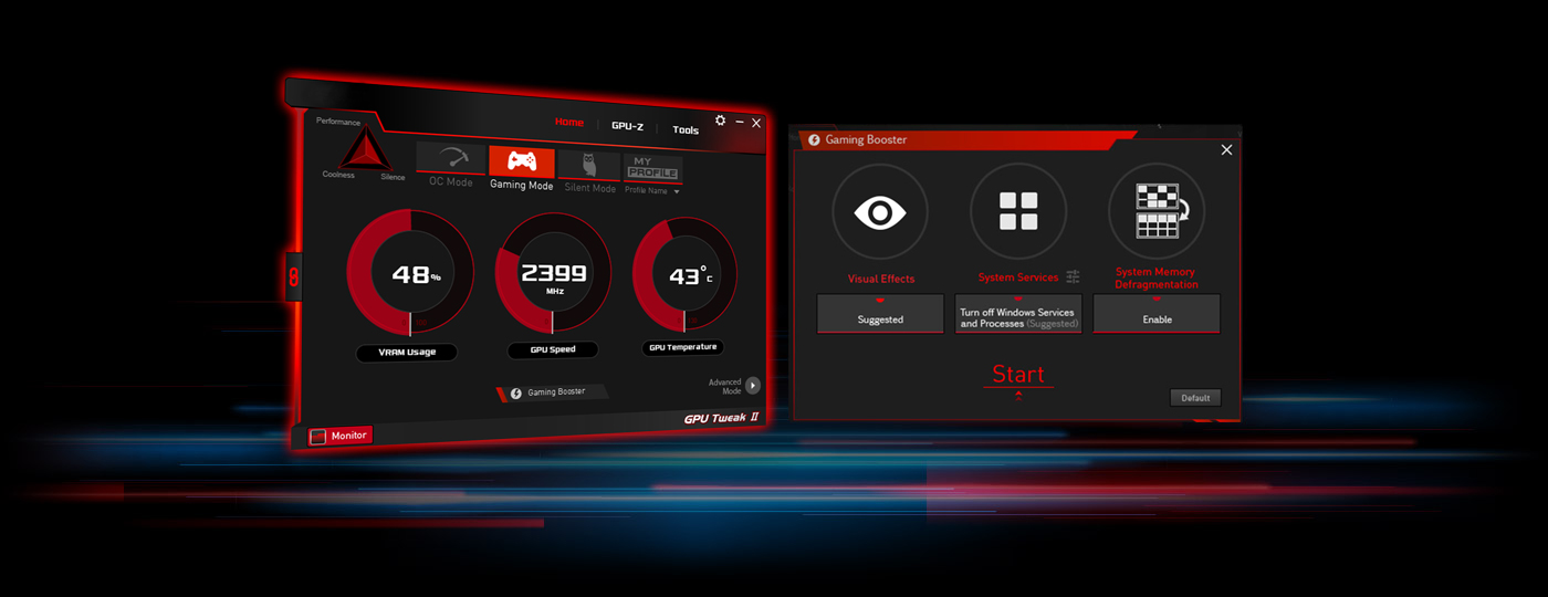 El software ASUS GPU Tweak II permite llevar las modificaciones a las tarjetas gráficas al siguiente nivel. Permite hacer modificaciones a parámetros críticos incluyendo GPU core clocks, frecuencias de memorias, configuraciones de voltajes y más, mediante la opción de monitorear todo en tiempo real mediante un display en pantalla. El control de los ventiladores avanzado es incluido así como también muchas más características que ayudan a sacar el máximo provecho a la ASUS ROG Strix RTX 2080 Ti O11G Gaming.