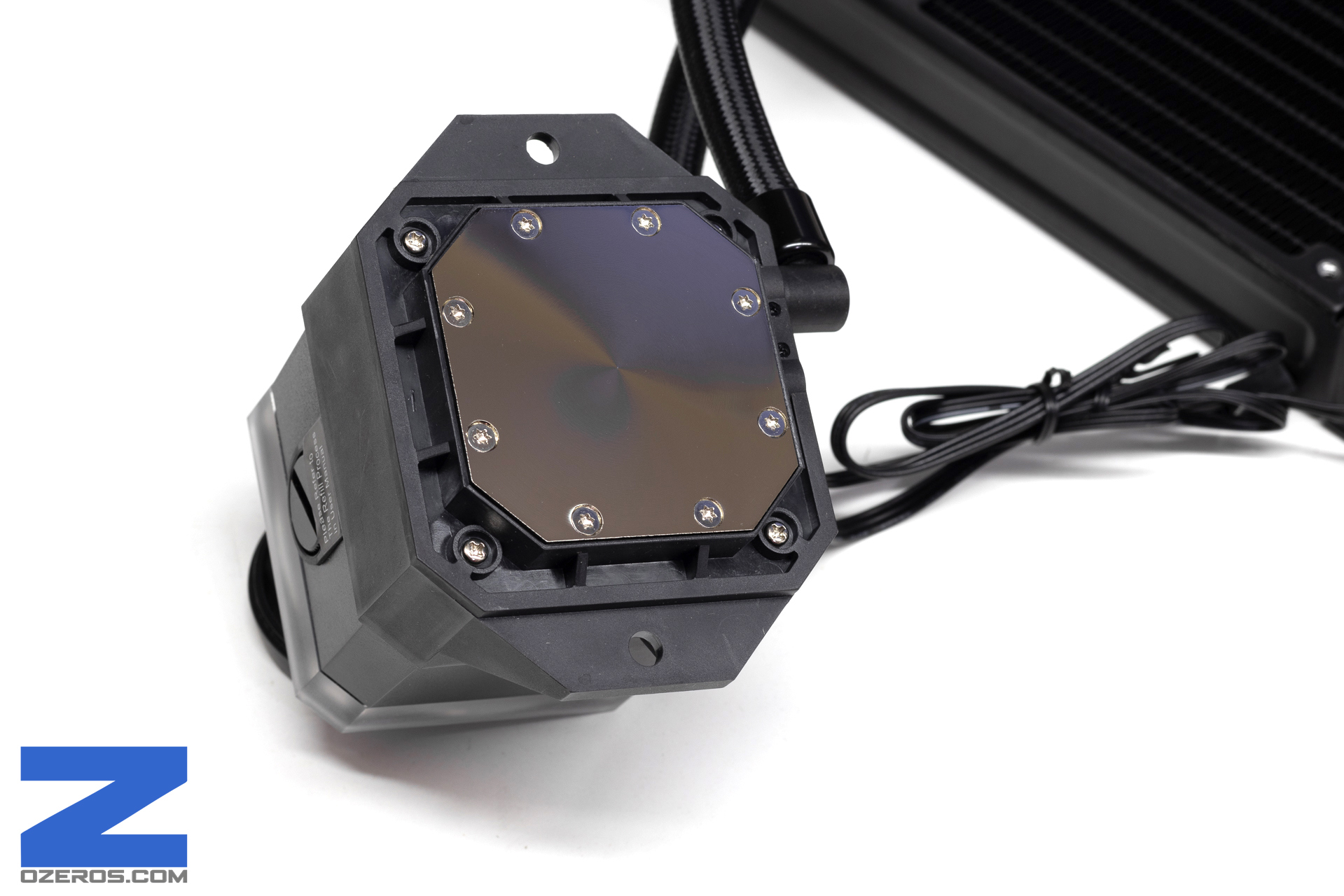 La bomba de agua / bloque, en primera instancia, posee una abertura en donde es posible recargar el líquido del sistema, además en la parte frontal posee una ventana en donde es posible chequear el nivel del agua y el flujo cuando se encuentre encendido, así mismo, incluye iluminación RGB controlable mediante la controladora modelo Core Box V2. En esta ocasión la pasta térmica no viene pre-aplicada, es incluida aparte y se debe aplicar con una espátula si se desea la cual viene incluida.