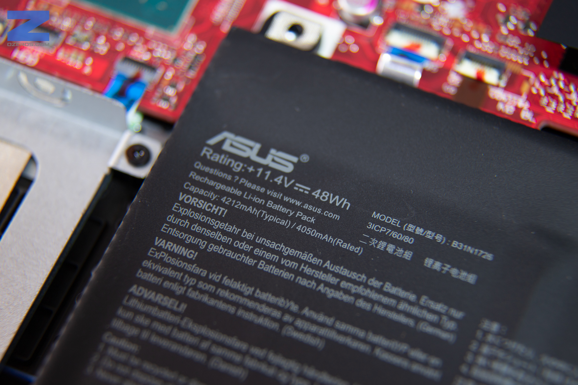 La batería es lo primero que vemos, y aquí está la explicación del rendimiento de este equipo en el apartado de energía. Es de 11,4v y 4212 mAh, y si bien gigante en tamaño, la verdad se hace poco para este modelo, ya que en uso normal de ofimática, internet o videos no dura más allá de 1 hora y media a 2 horas. Ni hablar de jugar sin conectar el equipo a la toma de corriente.