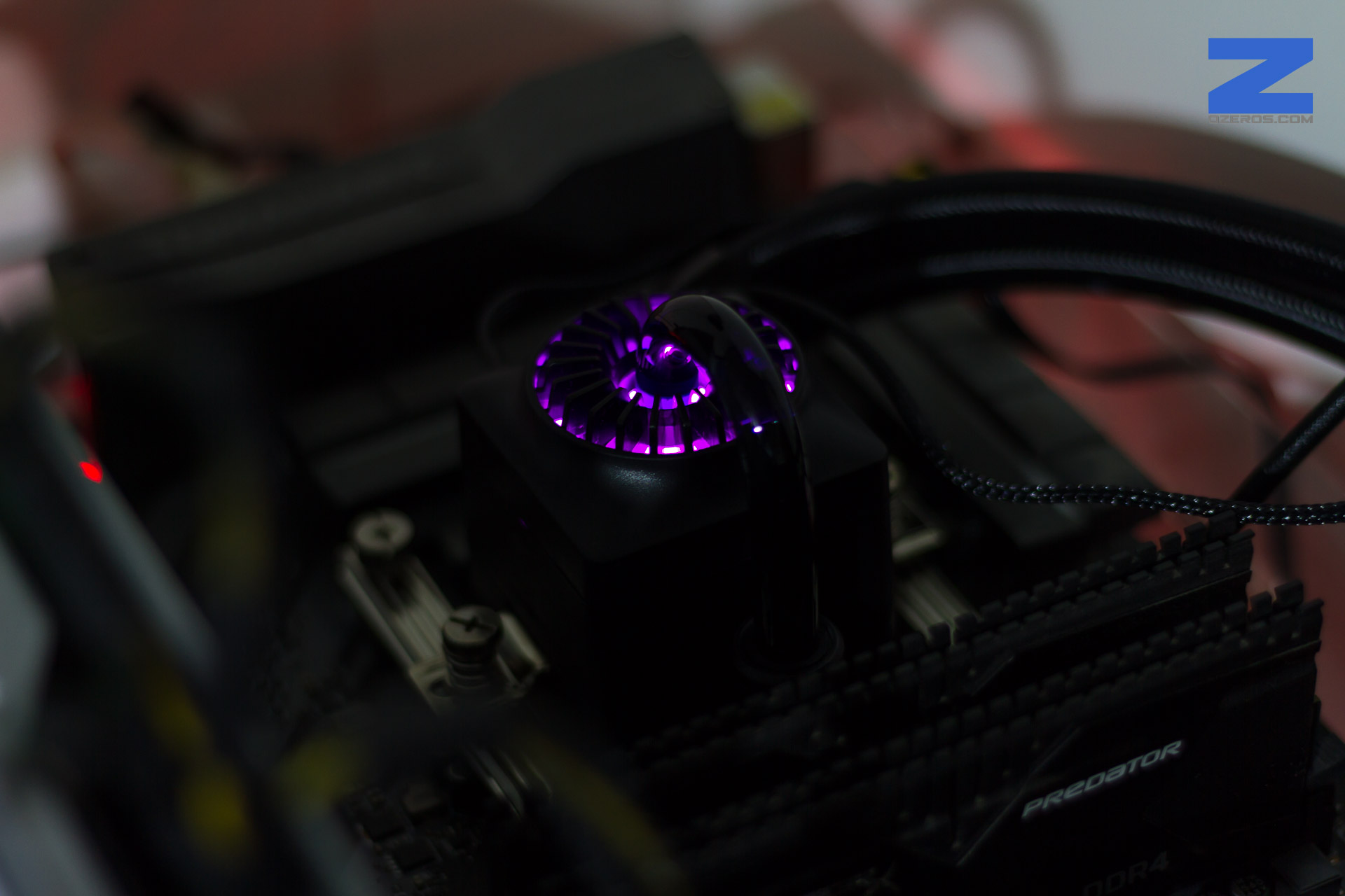 La bomba de agua / bloque posee un look de reactor el cual posee una manguera que ingresa para darle un mejor acabado estético, además de permitir visualizar el sistema de circulación de agua, incluye iluminación RGB controlable mediante un control alámbrico incluido y existe la posibilidad de ser controlado mediante software en caso de que la placa madre posea header RGB. La pasta térmica viene pre-aplicada como es en la mayoría de estos water cooler.