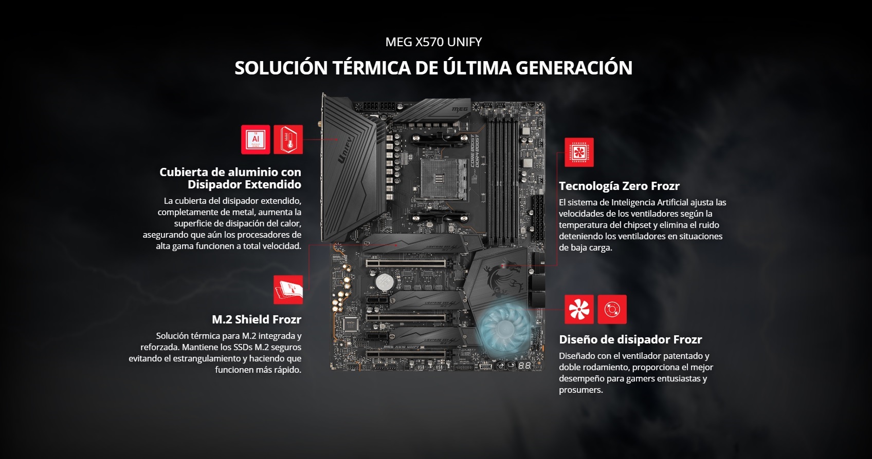 Con una compatibilidad con procesadores de segunda y tercera generación de Ryzen, la MSI MEG X570 UNIFY es una placa apuntada al segmento alto de placas madre, diseñada para gamers dispuestos a realizar un overclock extremo para lo cual está equipada con un disipador que incluye la tecnología Frozr propia de MSI.