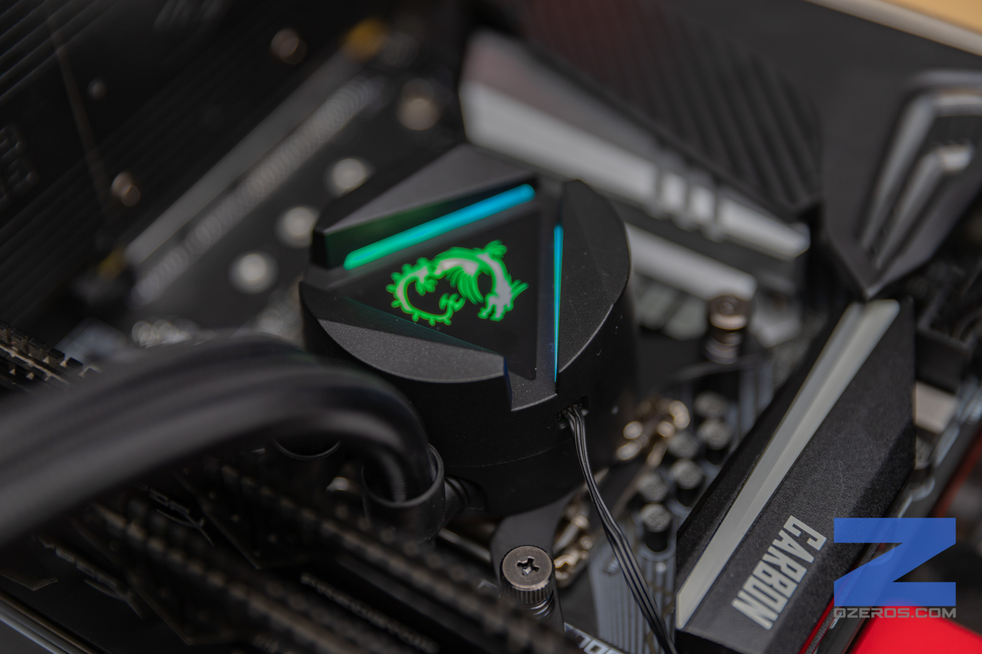 En cuanto al producto en sí, destaca la inclusión de la bomba de agua en el radiador, algo que sin dudas alargará la vida útil del producto debido a que aleja el motor de la fuente de calor. Por lo anterior, es que el bloque queda libre de bomba y MSI ha decidido colocar un sistema rotatorio en el bloque, permitiendo girar hasta 270° al dragón de la marca con iluminación RGB. En la parte inferior del bloque nos encontramos con un bloque de cobre, y en esta ocasión la pasta térmica no viene pre-aplicada como en la mayoría de estos WC-AIO, por lo que se incluye una pequeña jeringa con la solución termal.