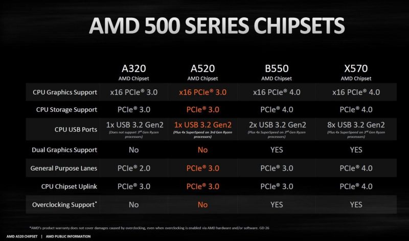 El A520, a diferencia de los otros chipsets lanzados junto a esta generación de procesadores Ryzen, no es compatible con PCIe 4.0, ni siquiera en los puertos M.2 y PCIe x16 que son soportados directamente por el CPU.