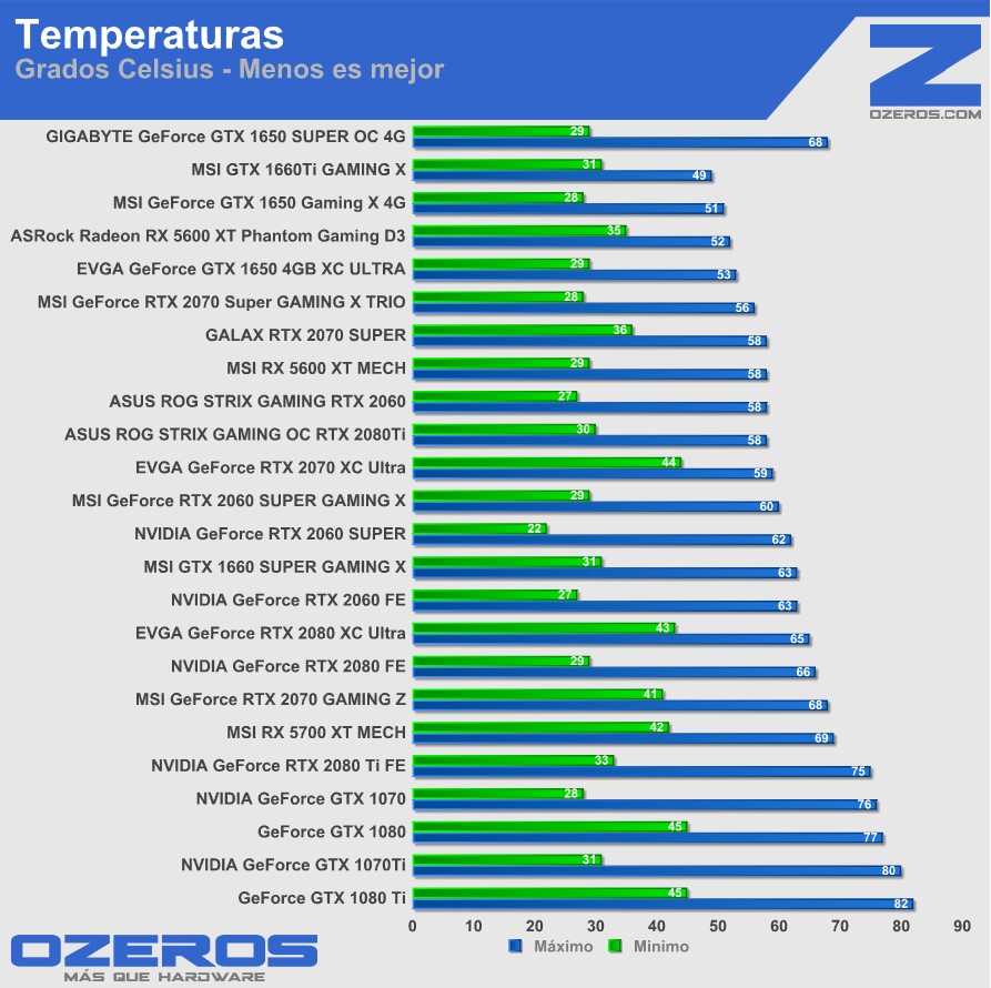 Siguiendo el proceso anterior aprovechamos de registrar las temperaturas del GPU en los momentos de máxima carga, quedando finalmente como sigue a continuación: