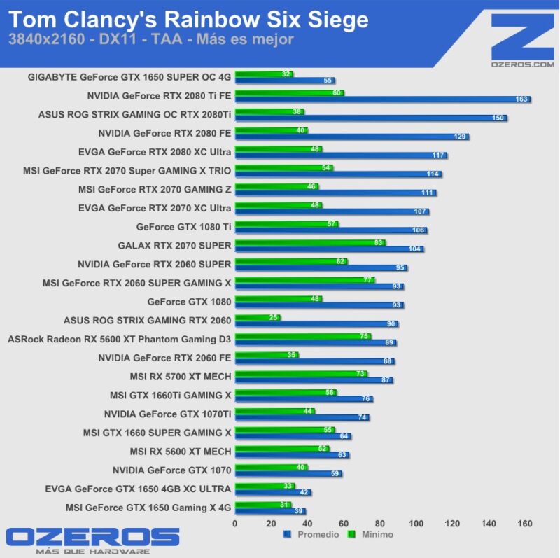 El rendimiento está acorde a lo indicado por NVIDIA, donde es superior a los modelos GTX 1650 que hemos probado anteriormente. Sorprende que la Gigabyte GeForce GTX 1650 SUPER sea capaz de ejecutar juegos en resolución 4K y en su máxima calidad pero a bajos FPS teniendo en cuenta que no es su enfoque.