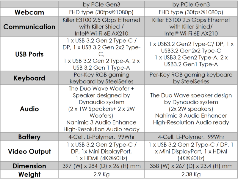 La pantalla de este modelo podrá ser elegida en resolución 4K o FHD, con hasta 300 Hz de refresco. En memoria, incluye hasta 64 GB de memoria DDR4-3200 y hasta dos unidades dual NVMe PCIe Gen 3.