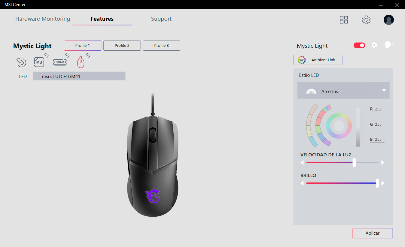 Finalmente para controlar la iluminación del Mouse, sólo basta con ir al clásico Mystic Light y encontraremos las opciones de personalización de color y efectos que este es capaz de ejecutar. Podemos elegir colores fijos o transiciones, además de poder guardar perfiles según se requiere.