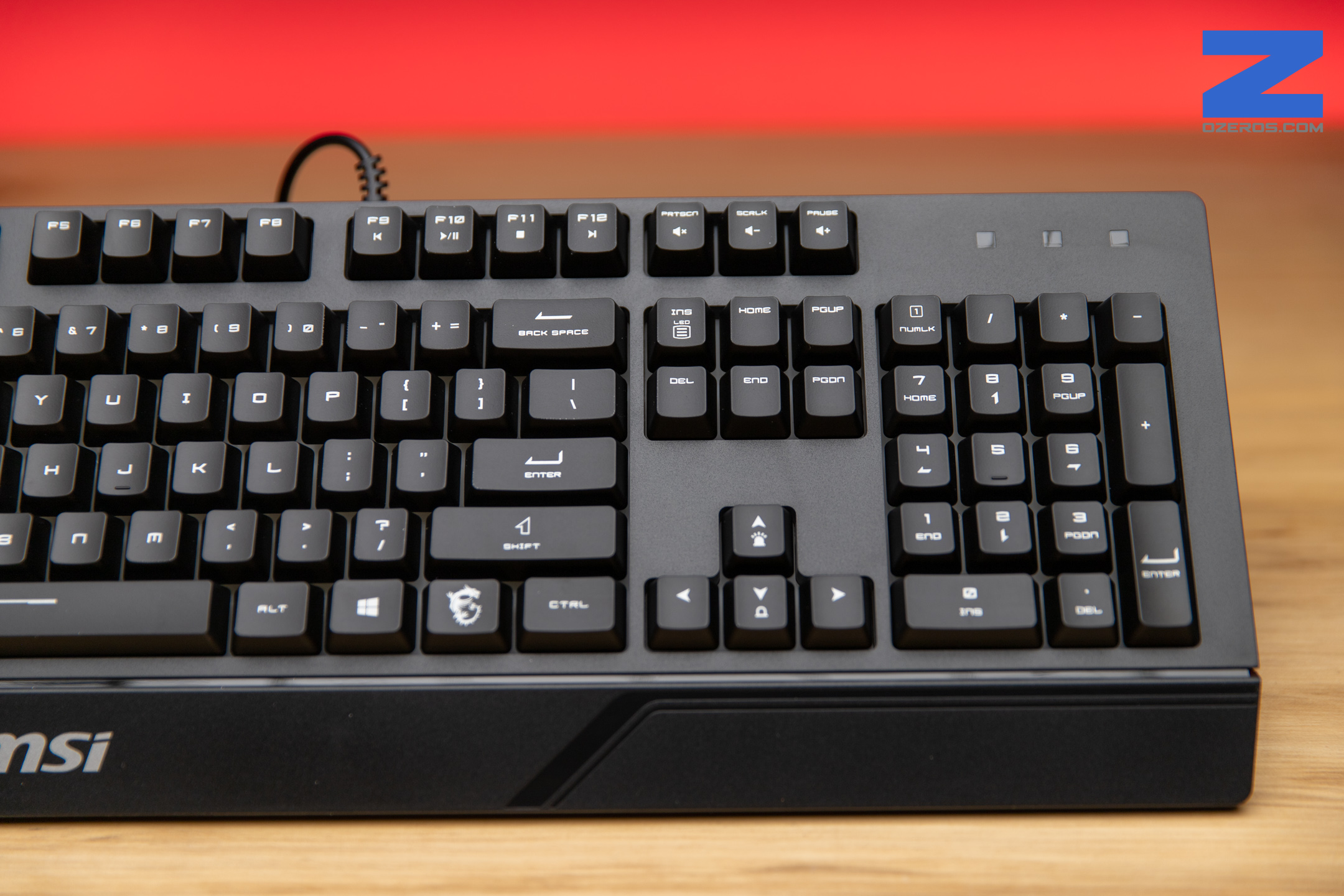 El MSI Vigor GK20 Gaming destaca por ser un teclado de orientación tradicional, lo cual personalmente me agrada ya que es mi perfil favorito de teclados. La disposición de las teclas es la correcta y el ángulo de cada keycap permite un tecleo rápido sin mayor novedad.