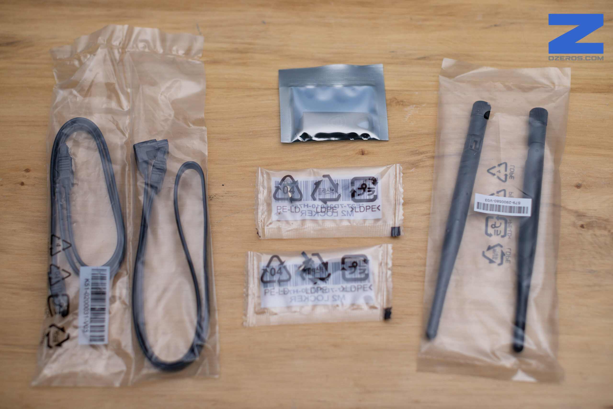 Además de manuales por supuesto que nos incluye los cables Sata, las antenas para el WIFI, tornillos y un pendrive.