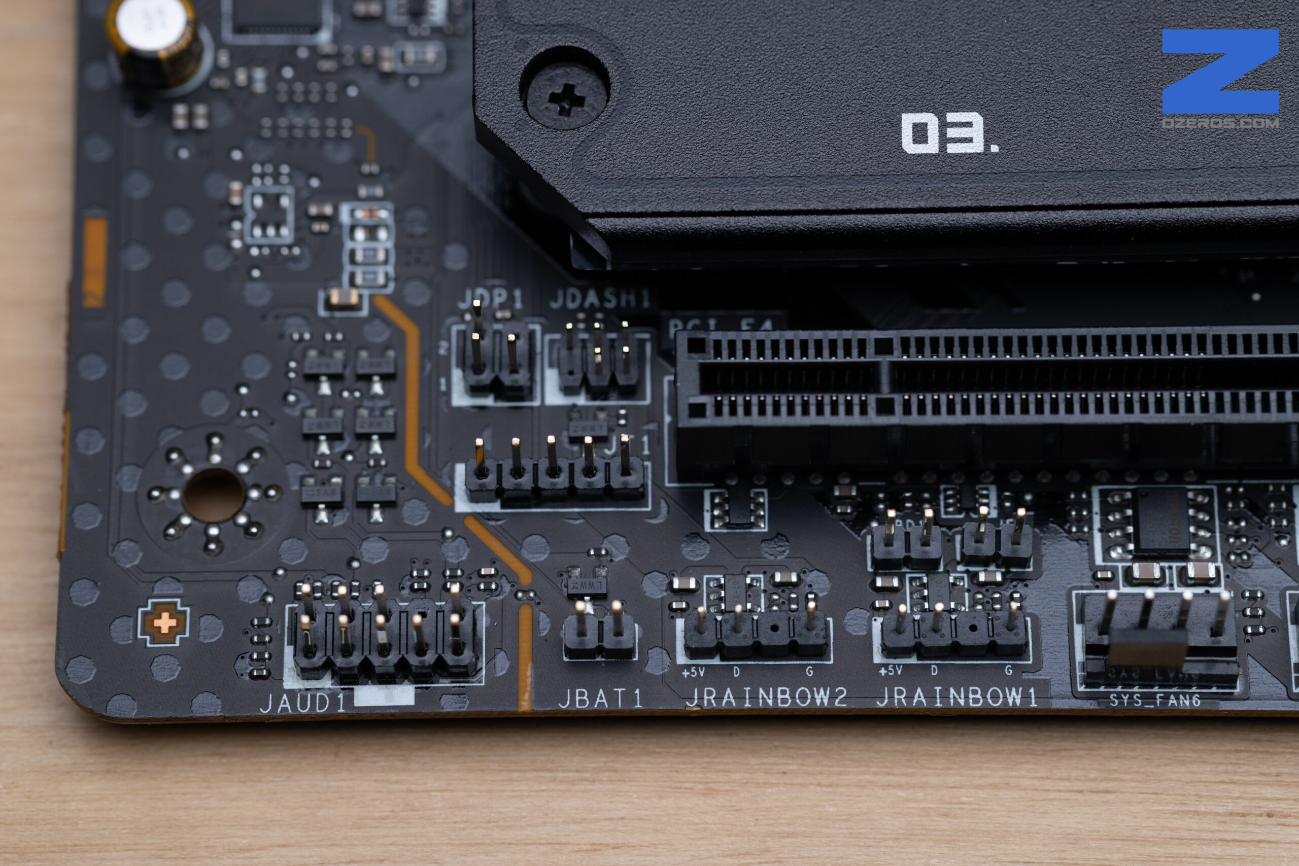 Pasando a los detalles de la placa, vemos una gran capacidad de conectividad en cuanto al RGB se trata con los conectores JRAINBOW1 y JRAINBOW2, además de los necesarios para el AUDIO, USB y ventiladores.