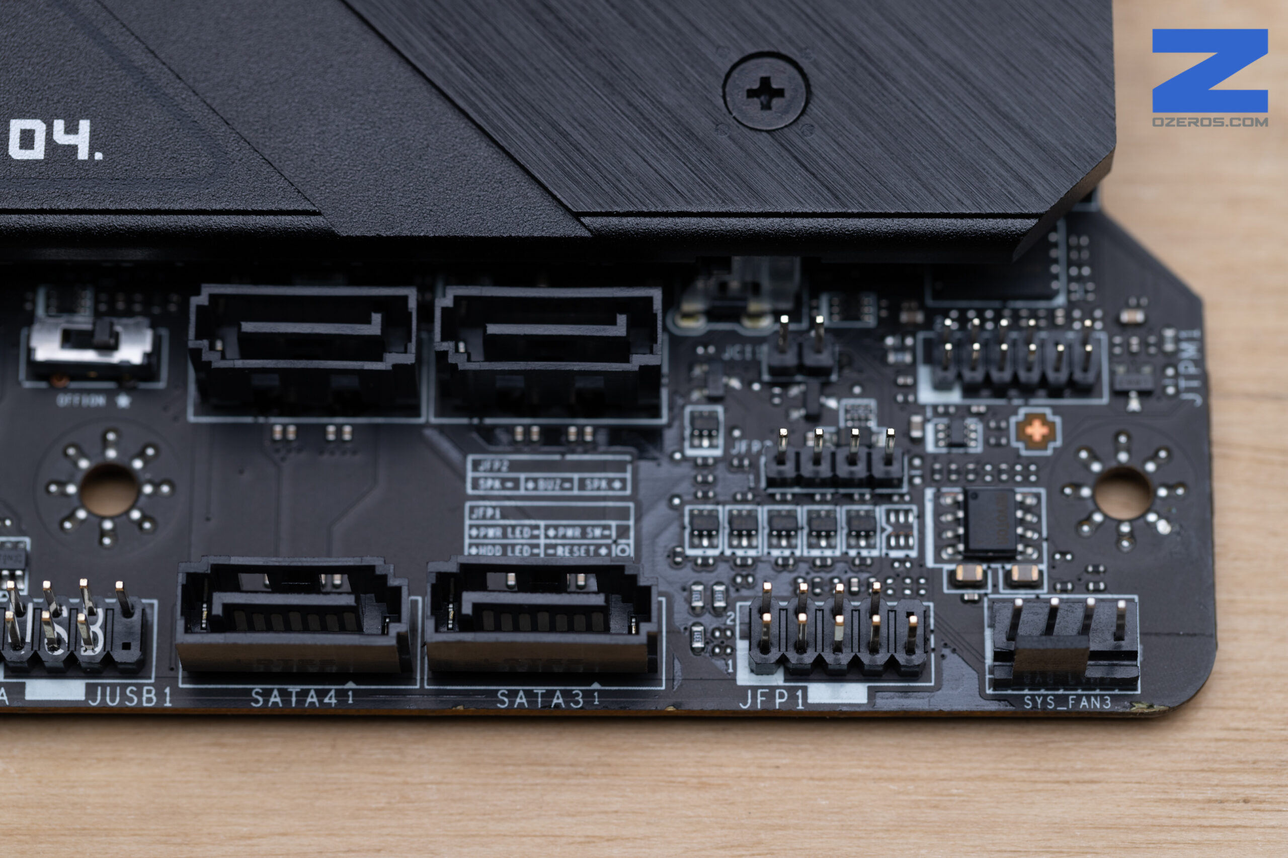 La muesca o calado que se ve en la orilla es algo relativamente inusual en las placas madres, ya que suelen ser simplemente rectas. En este caso ahí abajo del disipador que dice Tomahawk podemos ver escondido los puertos Sata para el almacenamiento tradicional.