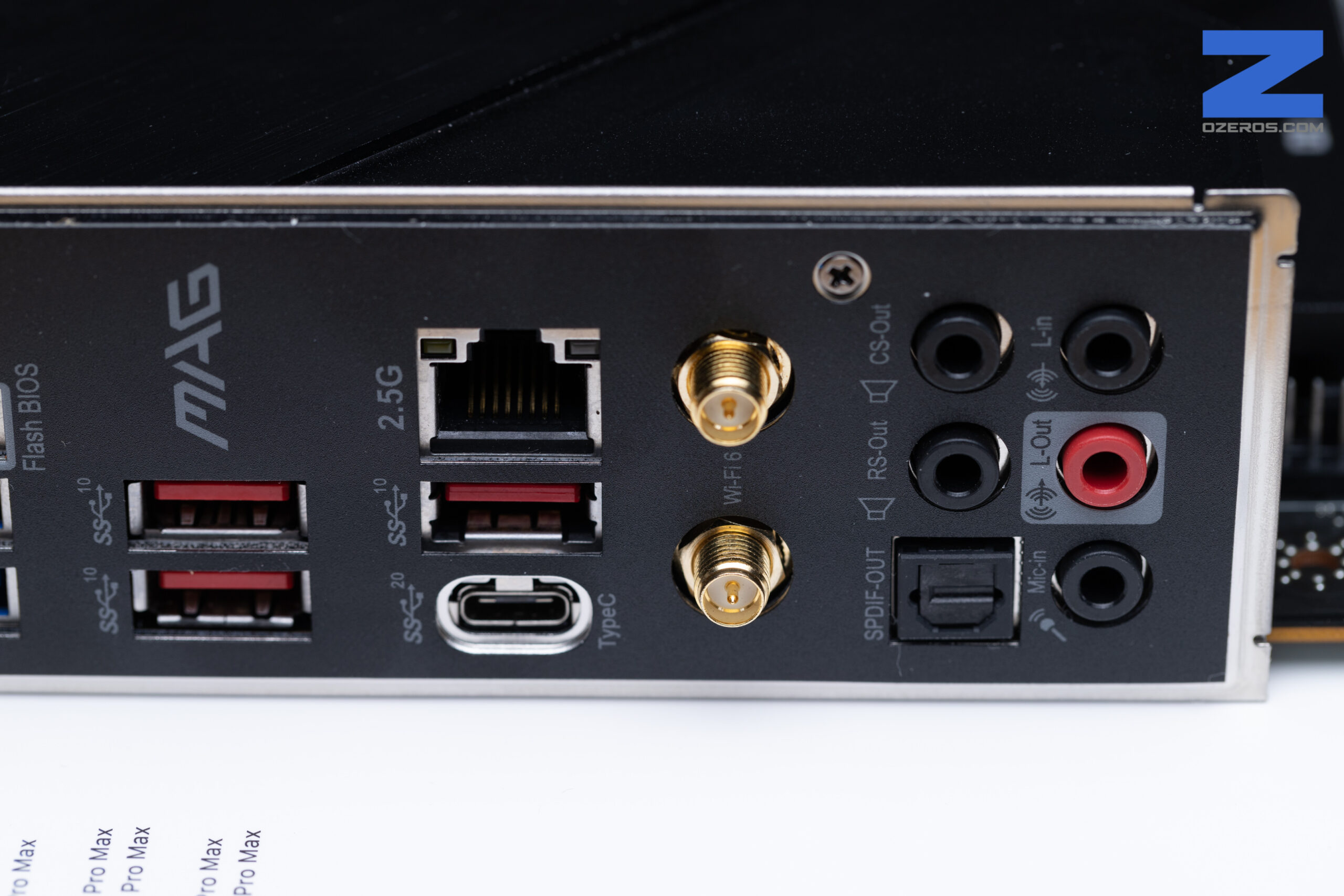 El panel trasero de la placa tiene gran capacidad de conectividad. Me llama la atención los 2 puertos de video en la parte superior (HDMI y Display port), ya que por lo general suelen venir mas abajo. Por otro lado destacamos el conector LAN de 2.5G, que como hemos dicho en otros reviews, es claramente el nuevo estándar que de a poco entra al mercado.