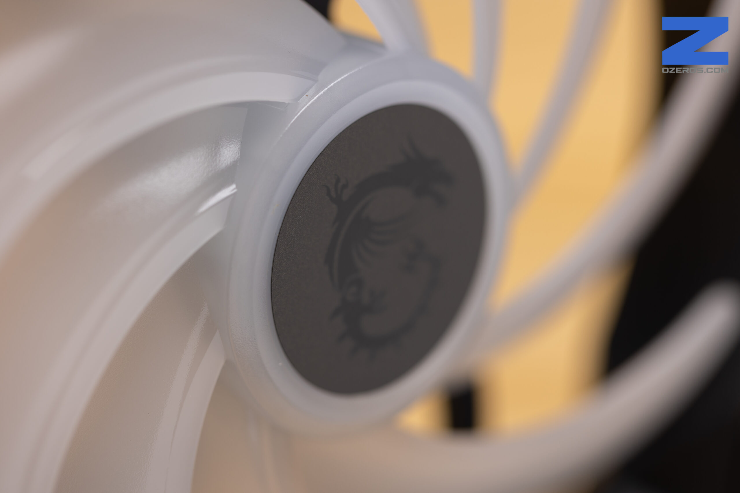 Los ventiladores incluidos son propios de MSI, con un sistema de doble rodamiento de bolas, y además incluyen iluminación RGB, el cual en conjunto con el bloque, dan un toque estético agradable a primera vista. Son de 140 milímetros cada uno y, debido a su velocidad máxima de rotación, el enfoque es el silencio, sin dejar de lado el rendimiento.
