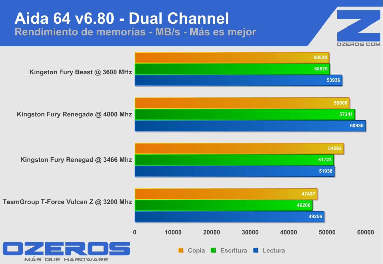 En nuestra primera prueba con AIDA vemos la diferencia de ancho de banda esperada al compararlas Kingston Fury Beast Special Edition con los modelos de Kingston de mayor y menor frecuencia. De todas formas el rendimiento es bueno pasando a los 50.000 MB/s en lectura en Dual Channel. Esta diferencia además se reduce muchísimo al probar en modo Single Channel (1 Stick de memoria) quedando muy cerca de modelos superiores en frecuencia, aquí pensamos que sus latencias un poquito altas hacen que mantenga este rendimiento promedio.
